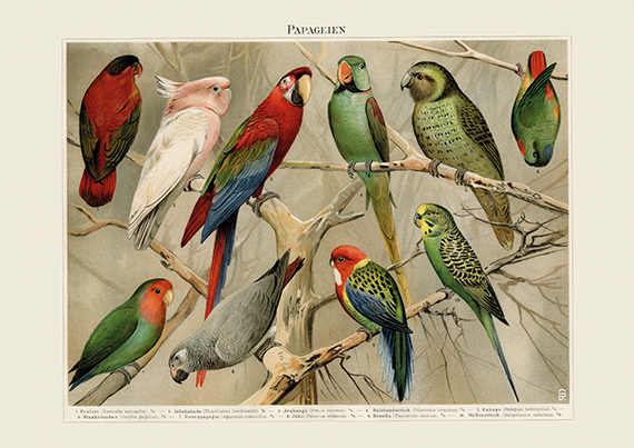 Growing up, I had a series of parakeets that I never quite managed to teach how to speak, but which I adored nonetheless. Celebrate our fine feathered friends with this lovely print featuring the Lovebird, Cockatoo, Macaw, Kakapo, African Grey Parrot, Rosella, and two types of Parakeets.