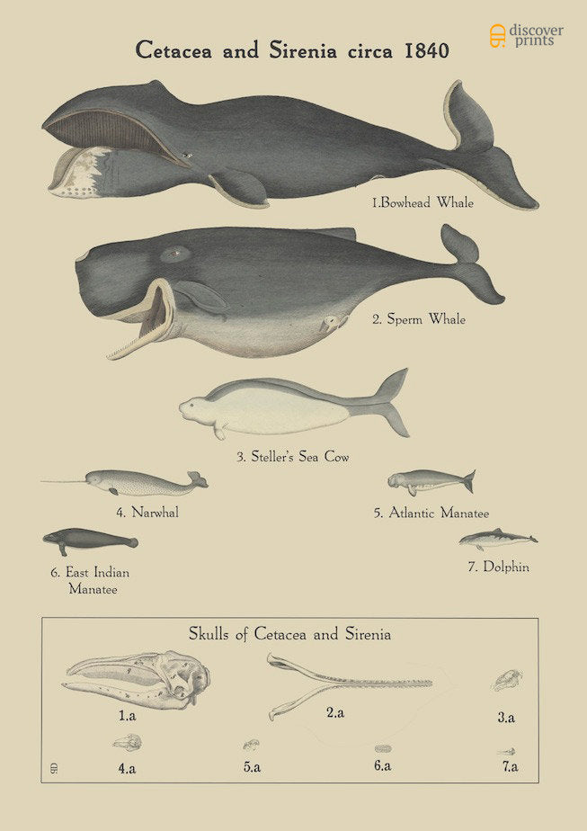 This museum-quality giclée contains: Bowhead whale, sperm whale, stellar’s sea cow, narwhal, manatee, dolphin