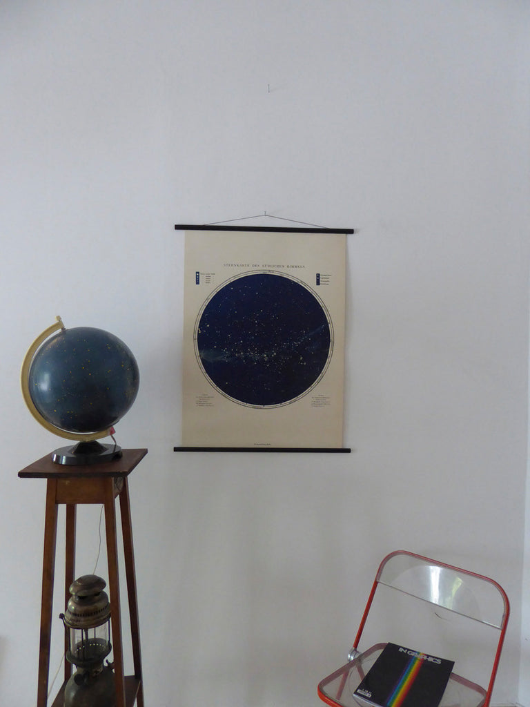 Our ancestors spent their nights looking into the deep night sky and imagining stories about gods and men drawn in the stars; not binge-watching 90s sitcoms online. Turn off your computer and learn how to identify the constellations of the Northern Hemisphere with this gorgeous giclée. Deep blue with stars shown in pale yellow, and information in German.