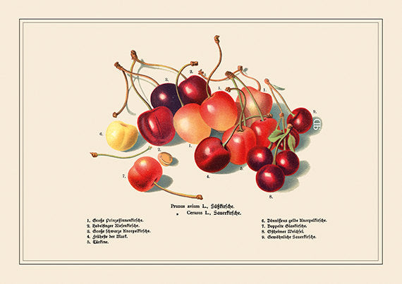 Here we present a lovely giclée of cherries from our fruit still life series. Within this section, you’ll find glorious grapes, plump plums, pretty peaches, nutritious nuts, boisterous berries, appetizing apples, perky pears, and quince. Each print is illustrated in the same style with similar colors, and they look absolutely lovely as a group in your kitchen, bedroom, kids room, or secret clubhouse.
