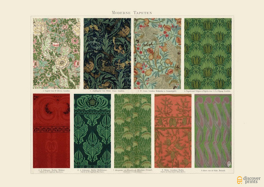 This beautiful giclée shows nine examples of intricate wallpaper designs ranging in styles from arts and crafts to art nouveau, featuring the designs of William Morris, Walter Crane and Henry Van De Velde among others. Perfect for the design enthusiast in your life.