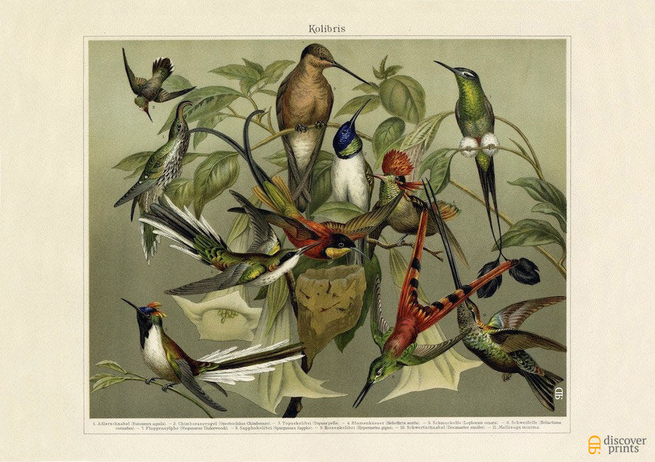This high-quality giclée contains: ruby throated hummingbird, Sword-billed, Hook-billed hermit