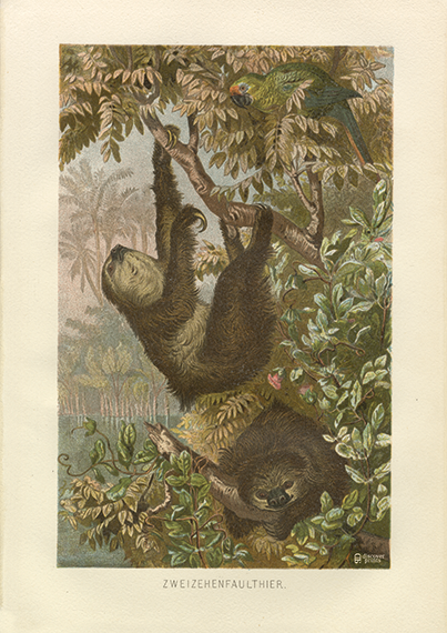 This fine art reproduction of an antique lithograph contains: Sloth, Parrot and Jungle