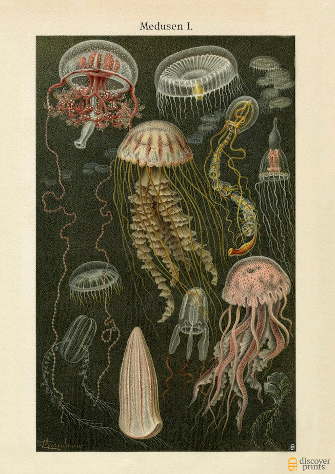 Reminiscent of Ernst Haeckel illustrations, this vintage giclee contains various species of jellyfish - some the most intricately beautiful organisms around. This version describes some of the complicated morphology in brilliant colors that are difficult to appreciate from undersea pictures.