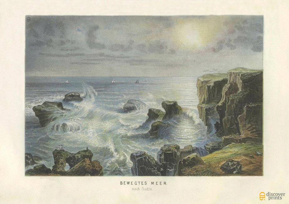 The sea is a cruel, salty mistress. Admire her from afar with no risk of getting seduced by wiley mermaids with this pretty seascape printed after an illustration from the turn of the century. Pretty blues, greys, and greens show a hazy afternoon and tumultuous waves, would show well in any room in your home or beach house. Shows quite well with our series of marine plants and animals that you can find in this section.