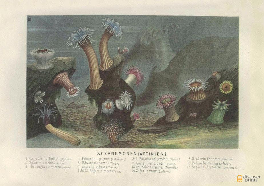 The latin name for Sea Anemone is “Actiniaria” which roughly translates to “fancy underwater spaghetti flower”. Harken back to your days playing in tidepools with this print of a lovely illustration by Giacomo Merculiano. Detailed and with subdued tones and a key of the latin names of the various different anemones, this print is sure to show beautifully in any room in your home or at the beach house.