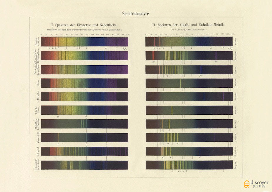 The complicated science of Spectroscopy has given us the means of deducing the chemical composition of far, far away stars and galaxies while producing really lovely visual indicators of these properties. Celebrate just how nerdy you really are with this giclée based on a science art of the spectral mapping of the sun, the star Sirius, and Albireo in Cygnus. The print also shows a number of alkali and earth alkaline metals.