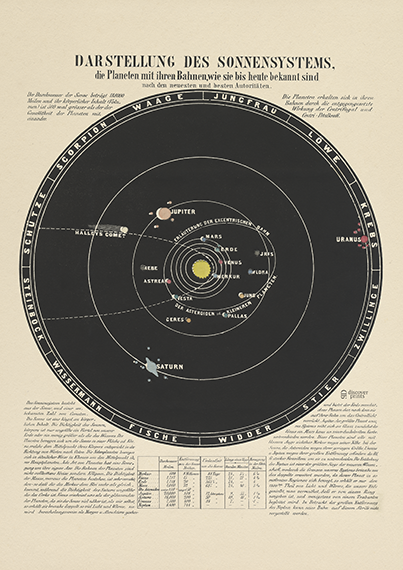 At times it’s hard to believe, but the universe does not center around me… I try to keep myself grounded with this wonderful print of our solar system. The images shows the pattern of orbit of comets and the planets around the sun, as well as a scaled comparison of the planets all against a lovely black background. Pluto hadn’t been discovered at the time this print was originally drawn!