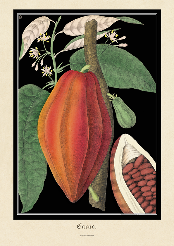 This is one of our absolute best-selling archival prints. Probably for the bold and dramatic way the colorful pods contrast with the black blackground that focuses attention on the artfully-done Cacao and leaves. But when I see this all I can think: “who in their right mind would take this, through it in a fire until it was black, grind it, mix it with the white stuff that comes from goats and cows, fill it with peanut butter, and put it in little pumpkins with handles for children?” Man, the Mayans were weird people.