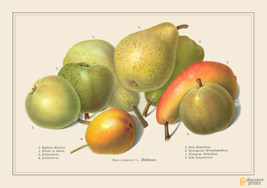 Here we present a lovely giclée of perky pears from our fruit still life series. Within this section, you’ll find glorious grapes, plump plums, pretty peaches, nutritious nuts, boisterous berries, cheeky cherries, appetizing apples, and quince. Each print is illustrated in the same style with similar colors, and they look absolutely lovely as a group in your kitchen, bedroom, kids room, or secret clubhouse.