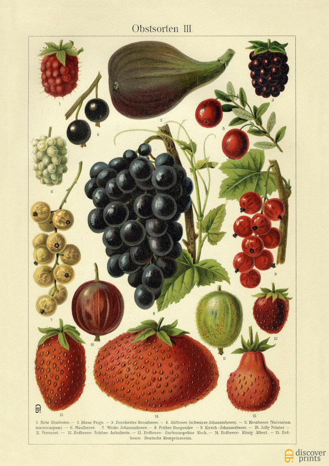 This vintage style giclee contains: strawberry, grapes, currants, figs, raspberries, blackberries