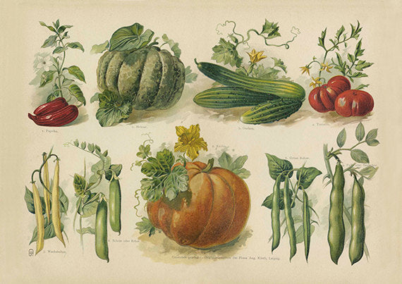 This high-quality giclée contains: pumpkin, cucumber, tomato, beans, pepper, squash