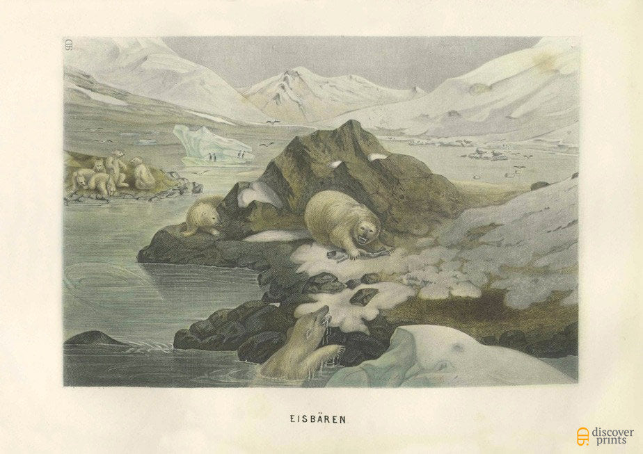 This giclée shows a number of odd-looking Polar Bears in a grey, icy environment; two bare their teeth over a tasty seal as a cub looks on from behind a rock. Put your fondness for these lovely creatures on display with this pretty print. Illustrated in subdued colors, this image shows very well in a series along with our sea anemone, sea cucumber, sea worms, lobster, sea turtle, and giant squid prints in this section. Perfect for the marine biologist or bear enthusiast in your life.
