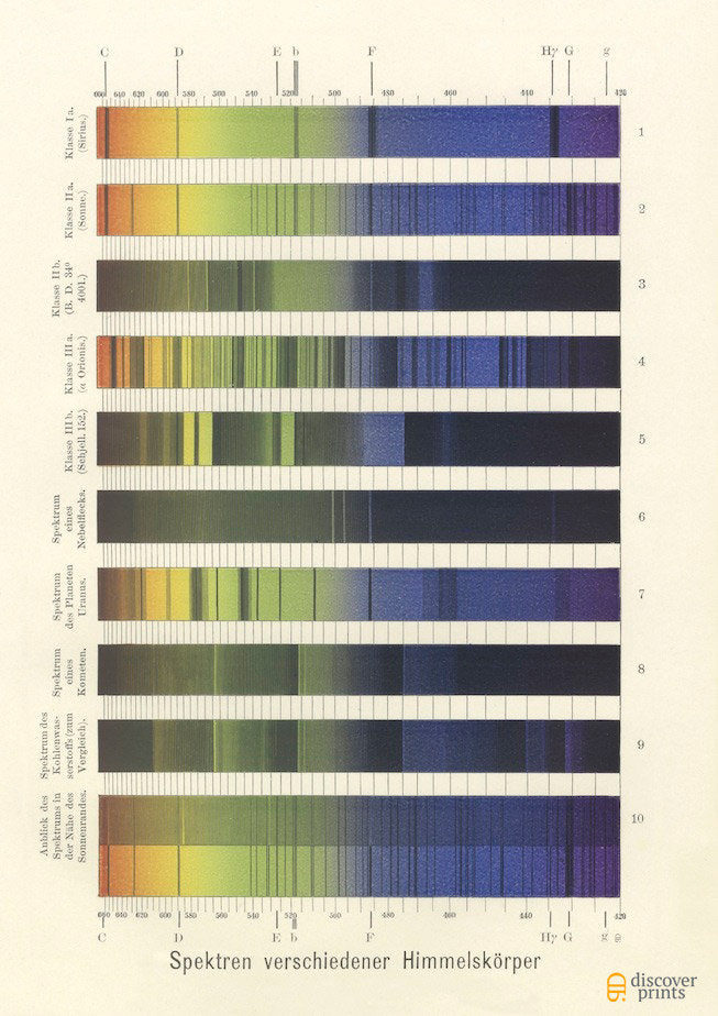The complicated science of Spectroscopy has given us the means of deducing the chemical composition of far, far away stars and galaxies while producing really lovely visual indicators of these properties. Celebrate just how nerdy you really are with this pretty print based on a science illustration of the spectral mapping of a number of different heavenly bodies.