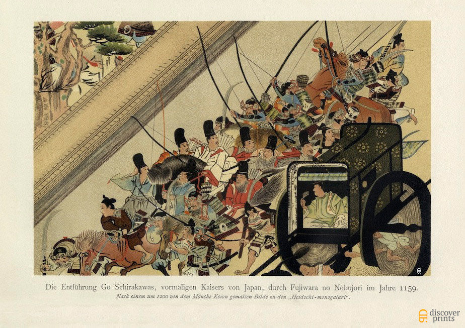 The Heiji Rebellion was a short-lived civil war in Japan in the year 1159, at the height of the war the emperor Nijo and the former emperor Go-Shirakawa were kidnapped by Fujiwara no Nobuyori in a poorly planned out scheme to make himself the Imperial Chancellor. Remind yourself to think ahead with this wonderful reprint of an illustration from 1907.