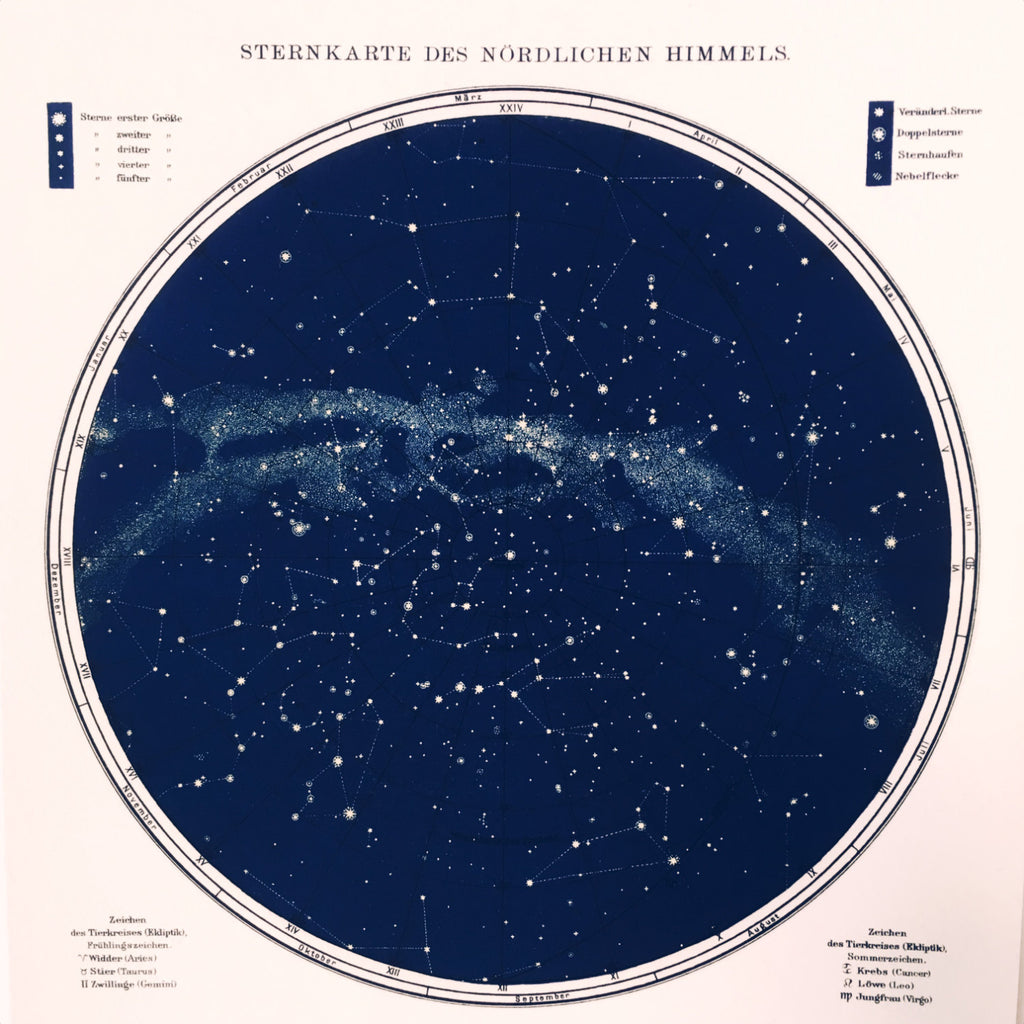 Our ancestors spent their nights looking into the deep night sky and imagining stories about gods and men drawn in the stars; not binge-watching 90s sitcoms online. Turn off your computer and learn how to identify the constellations of the Northern Hemisphere with this gorgeous giclée. Deep blue with stars shown in pale yellow, and information in German.